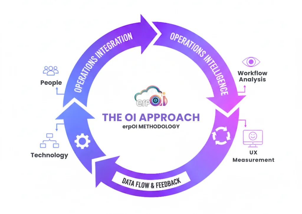 The engine driving the Transformation Continuum is our proprietary Operations Integration and Intelligence (OI) Approach. This is the core erpOI methodology for turning any organization into an Elite Digital Adopter. It is built on two synergistic pillars that form a continuous, self-improving loop.