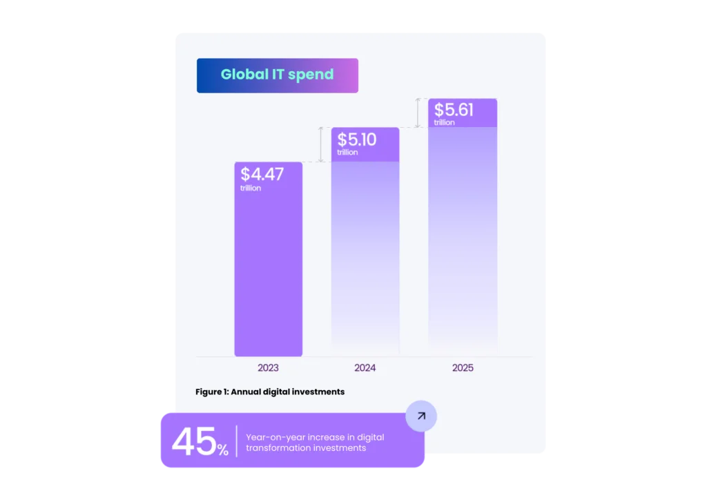 Despite a global economic climate marked by uncertainty, enterprise investment in technology has never been higher. According to Gartner, global IT spending is projected to climb from $5.1 trillion in 2024 to $5.61 trillion in 2025. Enterprises are aggressively increasing their digital transformation budgets by an average of 45% year-over-year. Yet, this record spending is not translating into proportional gains in productivity or value. In 2024, the average large enterprise lost $104 million from digital inefficiencies. This staggering figure can be broken down into three core areas of failure:
