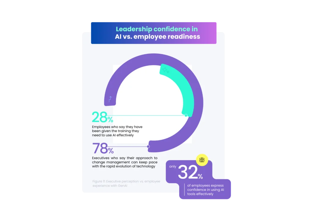 While executive suites are bullish on AI, a profound chasm exists between their strategic ambitions and the reality of employee readiness. This “Great Disconnect” is the single biggest threat to successful AI adoption and is clearly illustrated by the data: